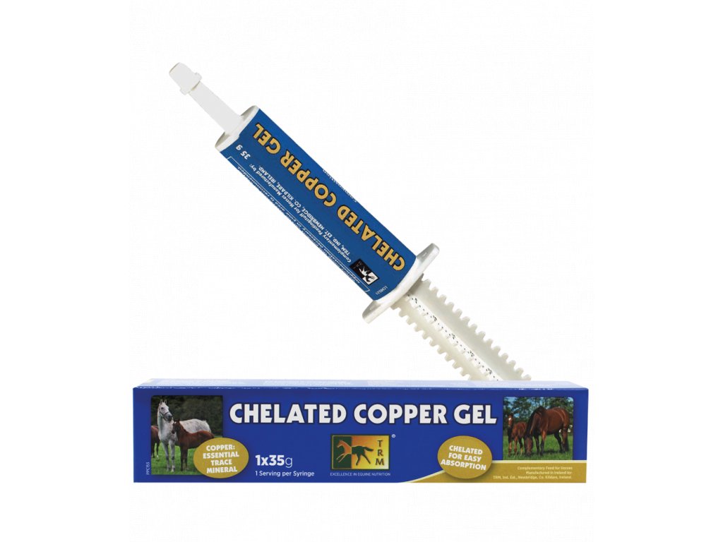 Jediné doplňkové krmivo svého druhu na sirupové bázi uznávaný odbornými autoritami v EU i v USA. Eliminuje různé projevy DOD,šimbajnů ktere jsou dědičné, osteochondrózy a deformace nohou především u mladých koní. Chelated Copper Gel je kvalitní doplňek, který byl formulovány tak, aby koně dobře vstřebávali měď. Doplňky Chelated Copper z firmy TRM jsou výsledkem sloučení stopového prvku mědi s aminokyselinami(cheláty). Tento proces velmi usnadňuje příjem mědi přes stěnu střeva do organismu koně. Anorganické krmné doplňky z mědi (např. sulfáty) nejsou tak snadno absorbovány a část základního prvku bývá následně ztracena vylučováním.